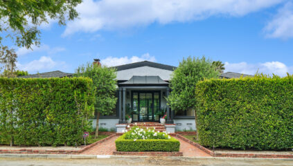This stunning. modern single story home sits on a premiere street in Brentwood. As you step into this beautiful home, you are greeted with vaulted ceilings, exposed wood beams and flawless indoor/outdoor entertaining from most rooms! Gorgeous ardwood floors throughout, built-ins, cozy fireplaces are all part of the charm in this special home! One side of the house boasts the primary bedroom with French doors to the aad. Spa-like bathroom, and walk-in closet, The 2nd bedroom En-suite has beautiful views of the trees and yard as well, fs powder room complete that side of the house. Sumptuous gourmet kitchen with top of the line appliances, leather marble countertops, wine fridge, and breakfast bar which seats 5 or more, and opens to the family room and outside patio for dinners alfresco, One bedroom En-suite off the kitchen plus laundry room, Mature hedges, setback and two car garage create 2 sound barrier from Sunset Blvd. Hurry as this one will not last!