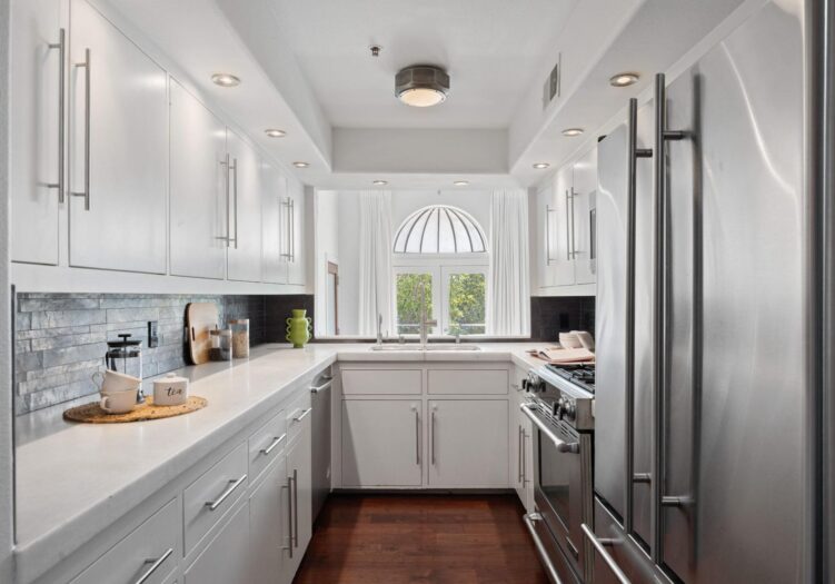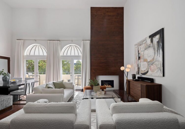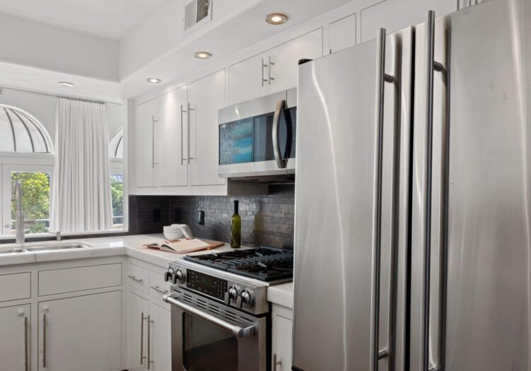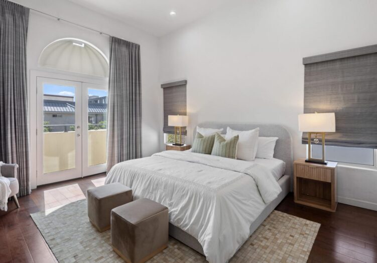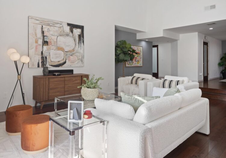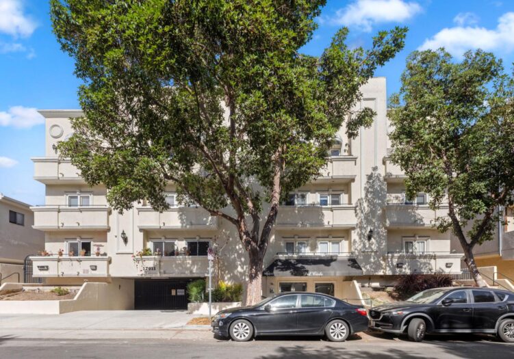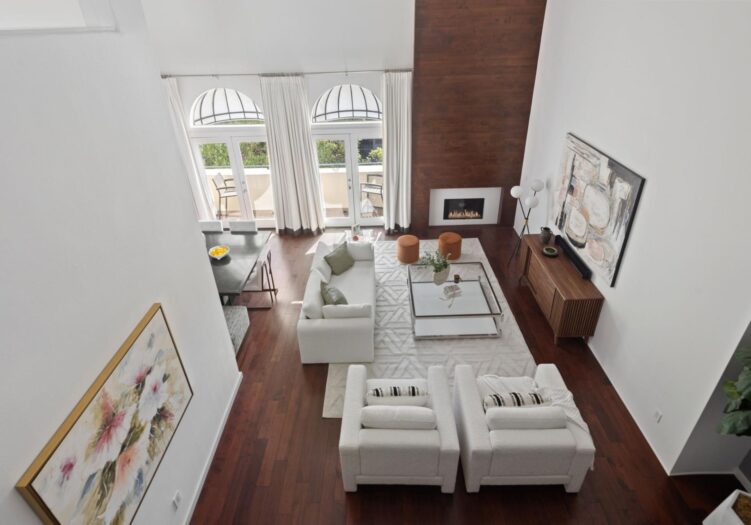 Penthouse with Soaring Ceilings & Exceptional Outdoor Space! Welcome to this Stunning Front Corner 2BR bedroom plus Loft/3rd Bedroom penthouse offering over 2,000 square feet of thoughtfully designed living space, dramatic cathedral ceilings, and beautiful hardwood floors throughout. Bathed in natural light from oversized windows, the expansive open concept living and dining area flows seamlessly to a private patio, perfect for indoor-outdoor entertaining. The kitchen is ideal for hosting or everyday living, while the soaring ceilings add volume and elegance to the space. The versatile loft/third bedroom En-suite doubles as a built-in office area and opens to its own private terrace, providing the ideal work-from-home setup or a peaceful retreat. The primary suite offers generous proportions, ample walk-in closet, and private balcony for a serene atmosphere. Located in a prime Brentwood neighborhood, this penthouse combines luxury, function, and location in one exceptional package. Laundry inside and 2 Car S/S Parking. Low HOA Dues. Close to Restaurants and Grocery.
